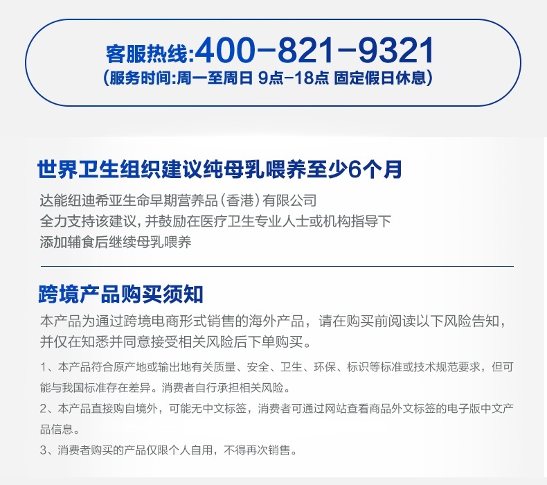 3. 跨境电商平台购买的境外商品可能无中文标签或者中文说明书,请留意网站产品中文介绍或者联系客服人员咨询(商财发[2018]486号文)。