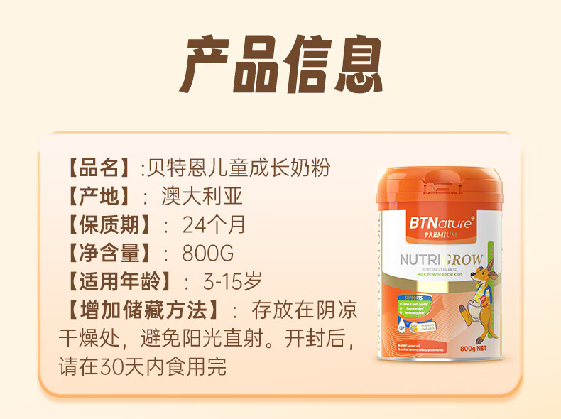 BTNature贝特恩儿童成长奶粉800g/罐(新旧包装随机))