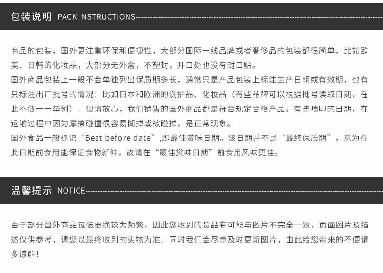 3. 跨境电商平台购买的境外商品可能无中文标签或者中文说明书,请留意网站产品中文介绍或者联系客服人员咨询(商财发[2018]486号文)。